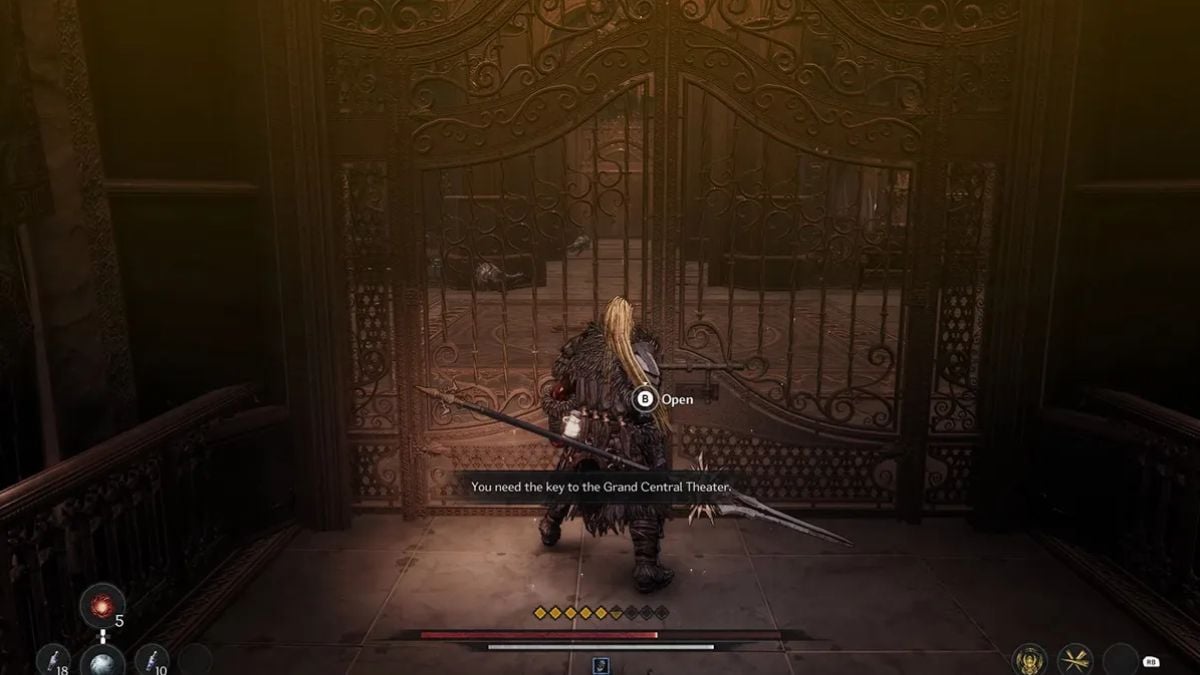 The Grand Central Theater Key is located inside a chest beneath the gate area. However, when you first go downstairs using the nearby stairs, you’ll find the gate locked from the other side. To reach the chest, you’ll need to take a different route: