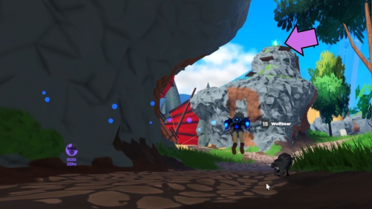 To find the Green Zero Gem, go back outside and stick to the right of the mountain. You'll be able to climb up on the side and find the Gem at the mountain peak. Pick it up, then jump back down since we need to find two more.
