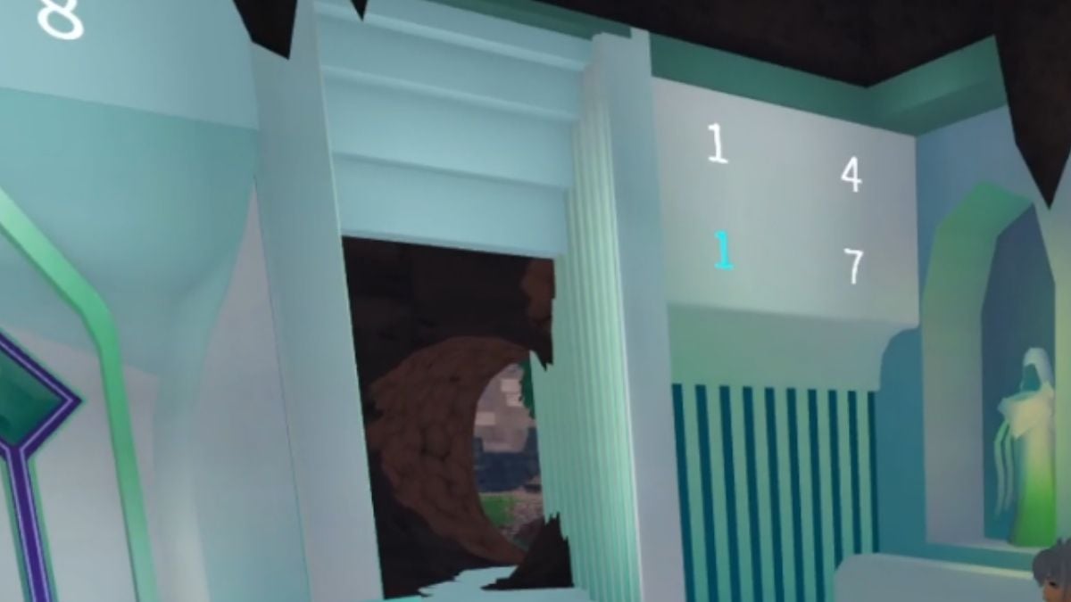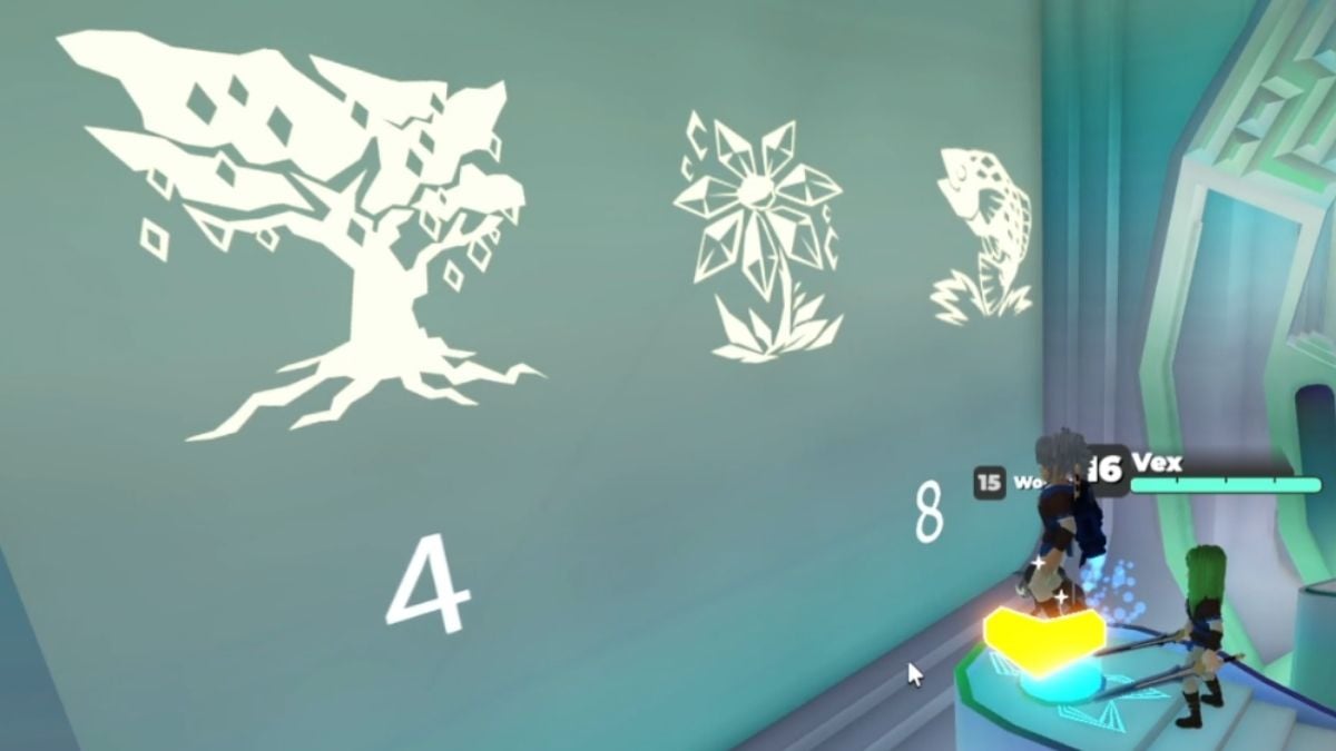 When you step on the left button, you can see numbers all around the room. The colors of these are the same as the crystals and they are also connected to the drawings on the right button. If the Tree is the first drawing, then you need to put the green numbers in the first number slot (after adding them up) as well as the green crystal in the first crystal slot.